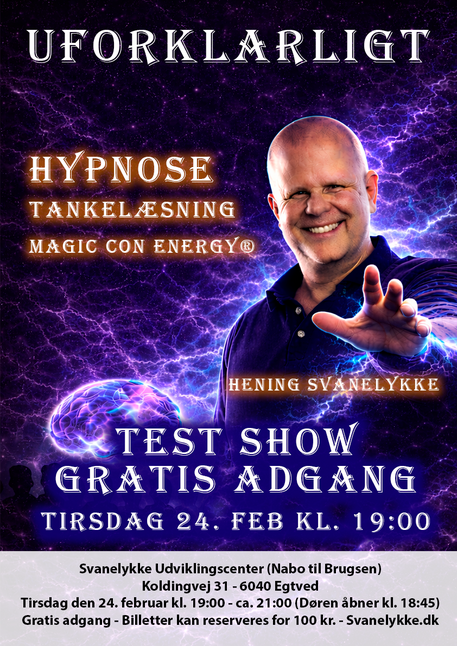 Kom med gratis til mit helt nye test Hypnose Show. Vi tester vores nye show. Tourplan bliver snart offentligjort i samarbejde med ticketmaster.